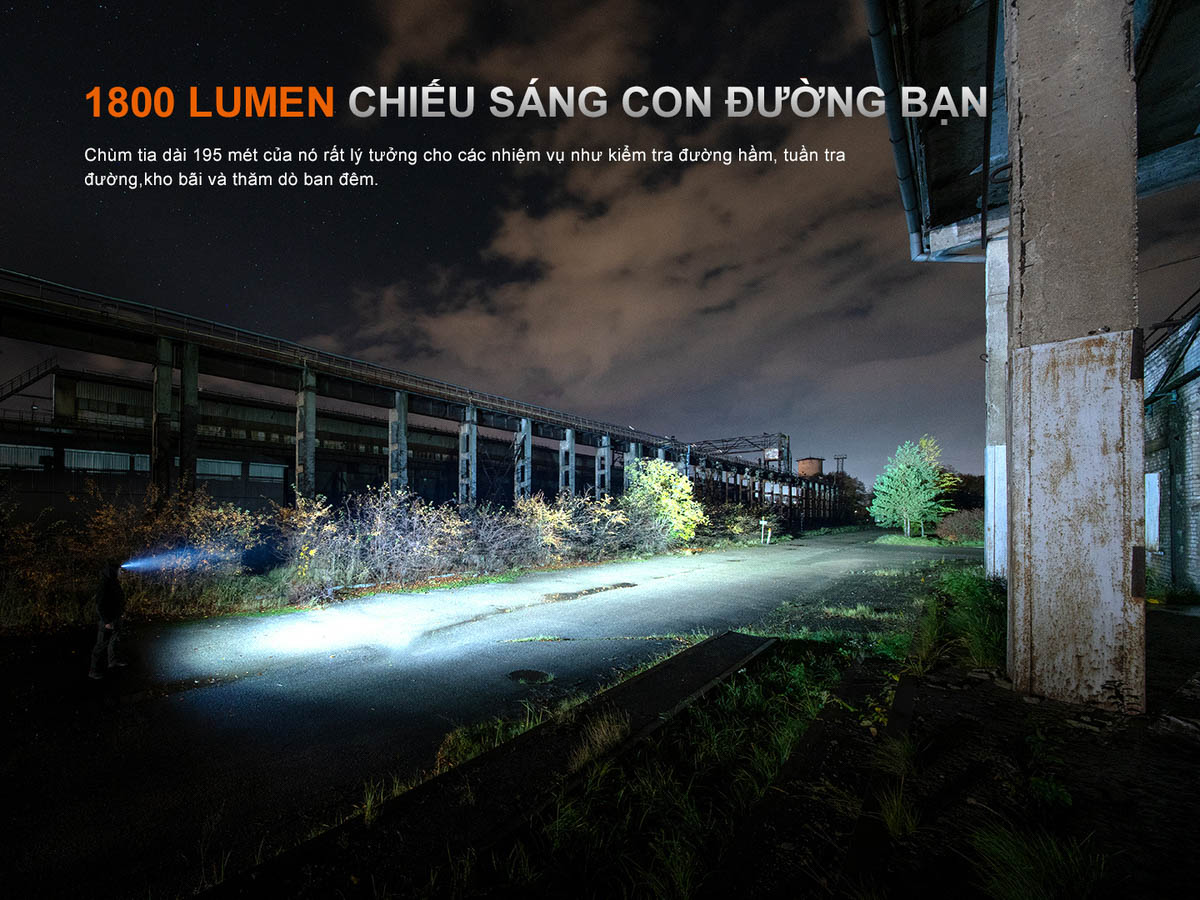 Công suất tối đa đạt 1800 lumen, cho tầm chiếu xa lên đến 195 mét, đáp ứng tốt các nhu cầu làm việc ngoài trời, kiểm tra công trình, di chuyển ban đêm hay xử lý các tình huống khẩn cấp trên đường.
