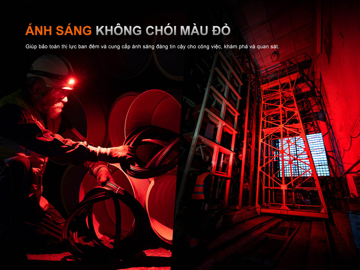 Bên cạnh ánh sáng trắng, đèn còn được trang bị đèn đỏ chống chói, giúp bảo vệ thị lực ban đêm, hạn chế làm lóa mắt người đối diện, không thu hút côn trùng và rất hữu ích trong các hoạt động như trekking ban đêm, quan sát bản đồ, cảnh báo an toàn hoặc sử dụng trong môi trường cần sự kín đáo.