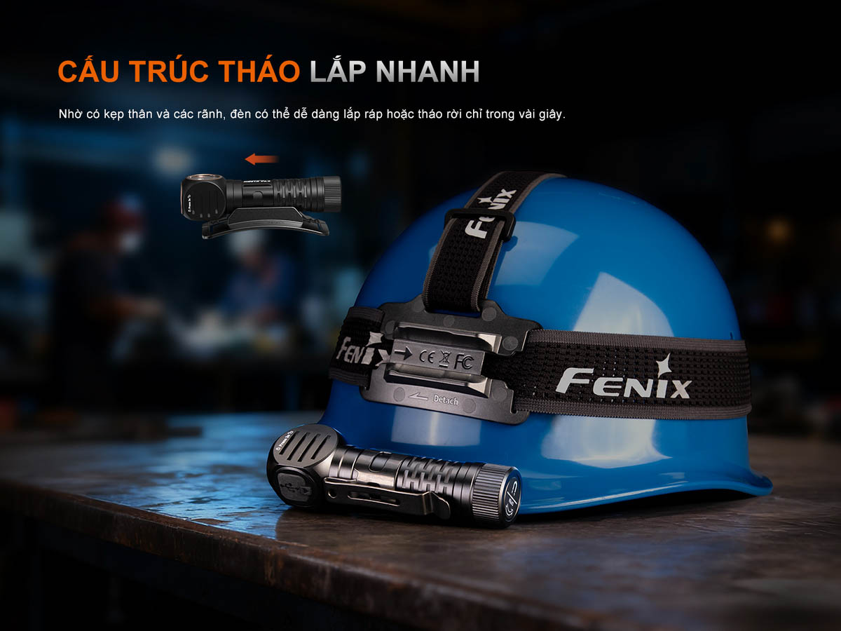 - Khả năng rảnh tay được Fenix phát huy tối đa nhờ clip gài kết hợp nam châm ở đuôi đèn, cho phép cố định đèn vào nhiều vị trí khác nhau như bề mặt kim loại, thắt lưng, túi đồ hay giỏ dụng cụ mà không cần cầm tay.