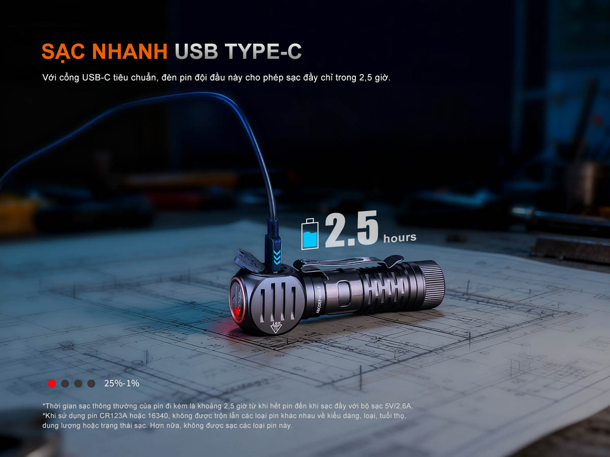 - Cổng sạc USB Type-C được tích hợp trực tiếp trên thân đèn giúp việc sạc trở nên tiện lợi và phổ biến hơn, có thể dùng chung với nhiều bộ sạc sẵn có trong gia đình. Thời gian sạc đầy chỉ khoảng 2,5 giờ với củ sạc 15W. Trong các trường hợp khẩn cấp, đèn vẫn có thể hoạt động với pin CR123A hoặc pin 16340 (không hỗ trợ sạc với các loại pin này).