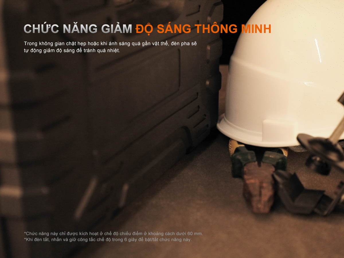 - Ở chế độ chiếu xa, khi đầu đèn đặt gần vật cản (khoảng 6 cm), đèn sẽ tự động giảm dần độ sáng để tránh sinh nhiệt.