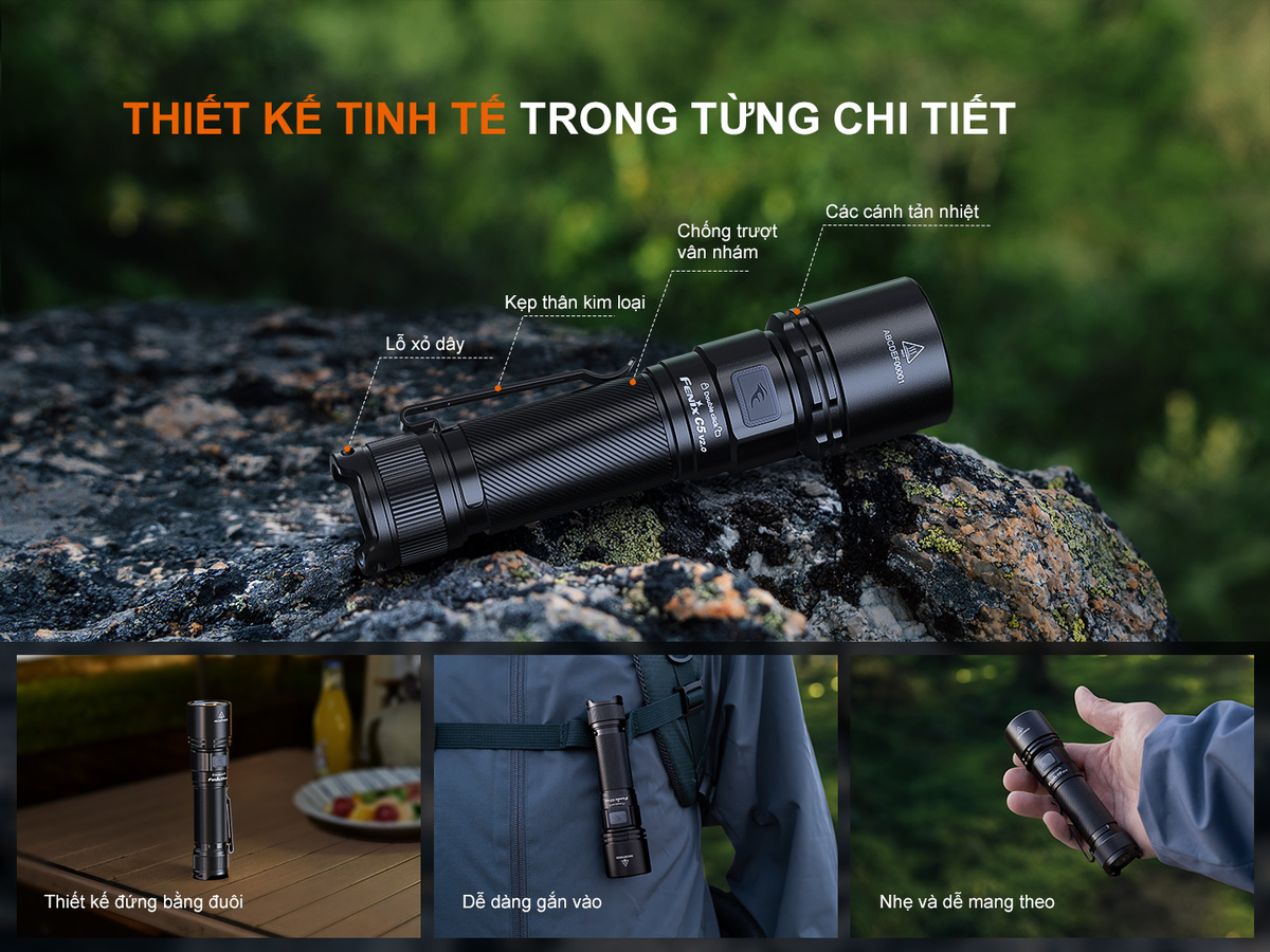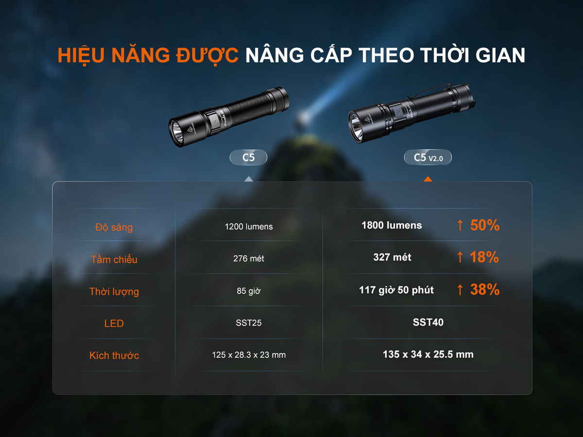 - Fenix C5 V2.0 được phát triển như một công cụ chiếu sáng đúng nghĩa: thiết kế tối giản, thao tác trực quan, tập trung hoàn toàn vào hiệu suất và tính thực tế. Với công suất tối đa 1800 lumens và khả năng chiếu xa tới 327 mét, C5 V2.0 đủ mạnh để đáp ứng hầu hết các tình huống từ đi lại ban đêm, sửa chữa, dã ngoại cho tới trekking hay làm đèn dự phòng khi cần.
