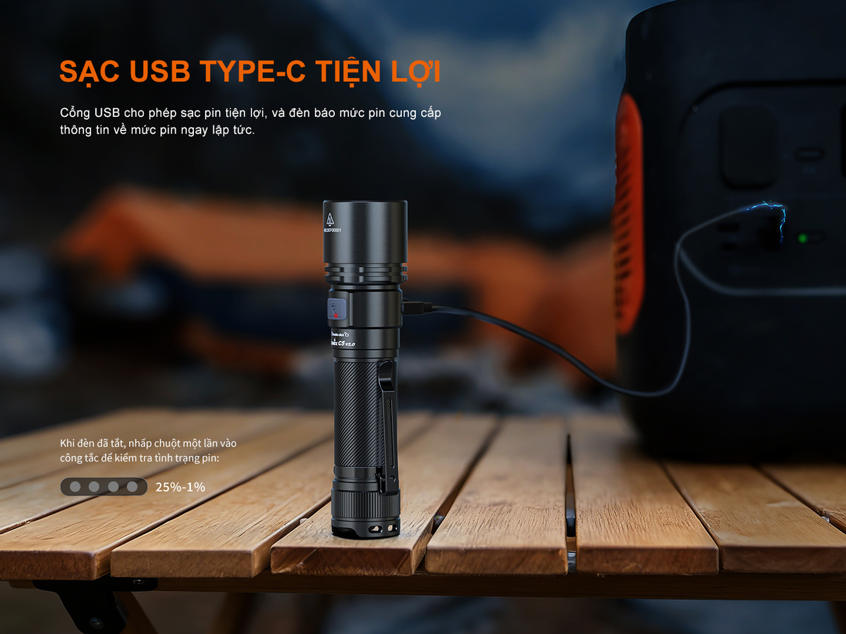 - Fenix tiếp tục tiêu chuẩn hóa cổng sạc USB Type-C trên C5 V2.0, cho phép dùng chung cáp với smartphone và các thiết bị điện tử trong gia đình (nguồn sạc tối ưu 5V – 3A), mang lại sự tiện lợi tối đa khi sử dụng hằng ngày.