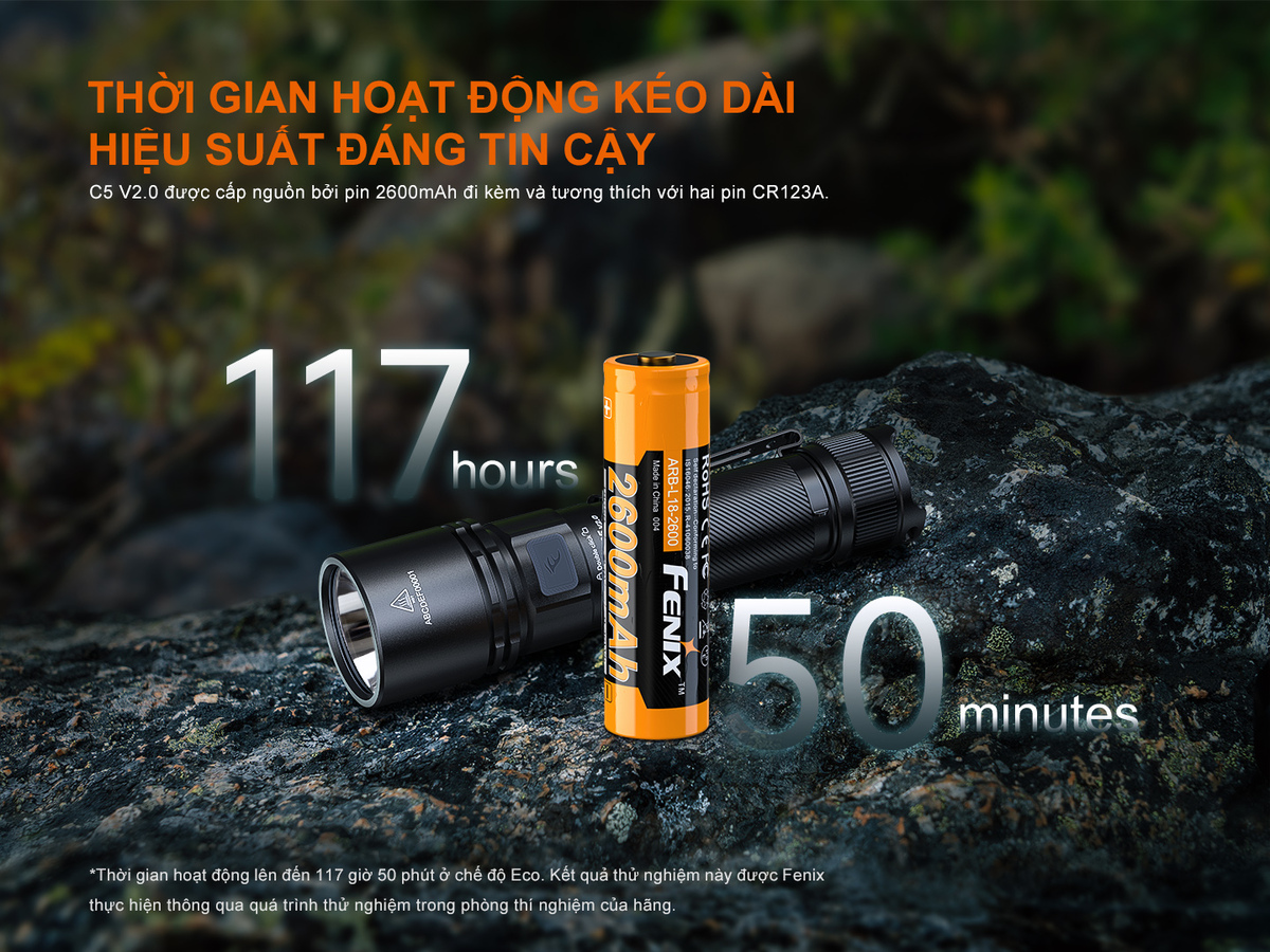 - Đèn sử dụng 1 pin sạc 18650 dung lượng 2600mAh, cho thời gian sử dụng tối đa lên tới 117 giờ ở chế độ Eco. Trong các tình huống khẩn cấp, C5 V2.0 vẫn có thể hoạt động với 2 pin CR123A (không áp dụng sạc), tăng tính linh hoạt khi cần thay thế nhanh.