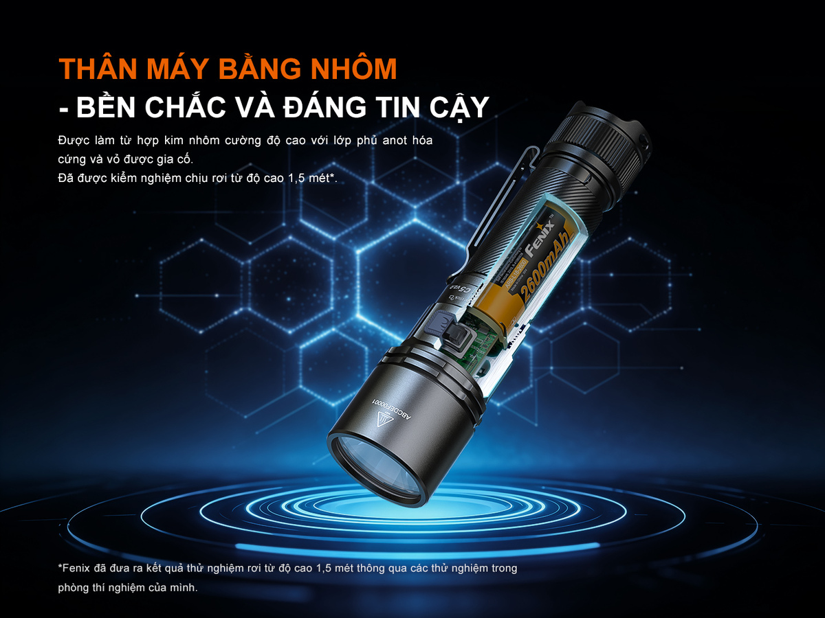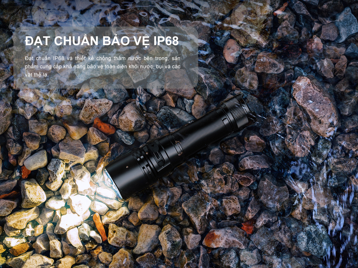 - Fenix C5 V2.0 đạt chuẩn chống bụi, chống nước tiêu chuẩn IP68, chịu được va đập rơi từ độ cao 1,5 mét trên 6 góc cạnh, sẵn sàng hoạt động ổn định trong các điều kiện môi trường và thời tiết khắc nghiệt.