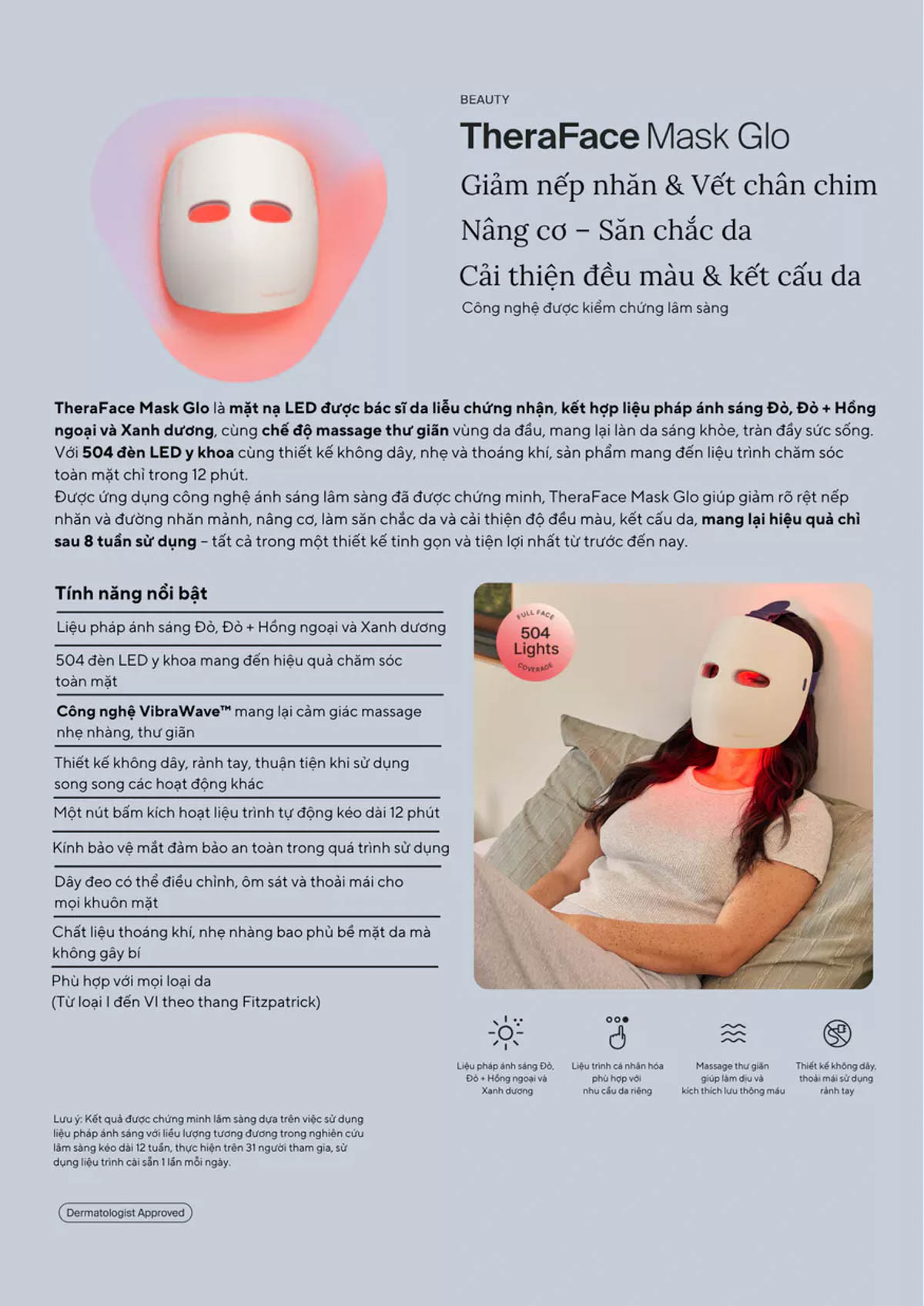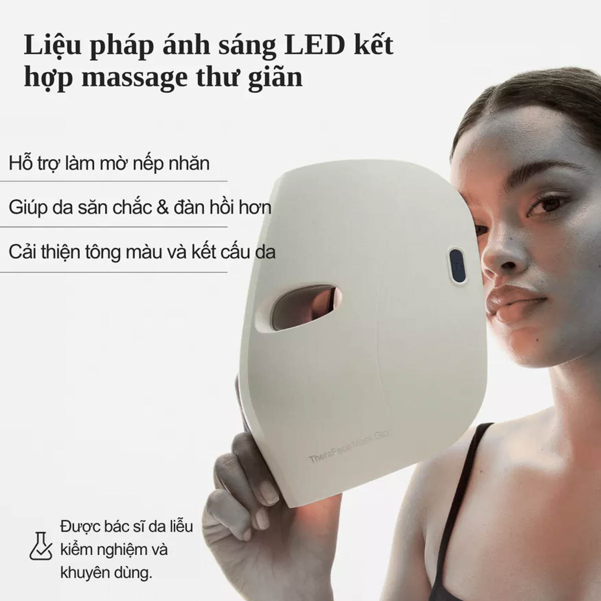 TheraFace Mask Glo là mặt nạ LED được bác sĩ da liễu kiểm định, kết hợp liệu pháp ánh sáng Đỏ, Đỏ + Hồng ngoại và Xanh dương cùng massage da đầu thư giãn, hỗ trợ cải thiện làn da trở nên sáng khỏe và đều màu hơn.
