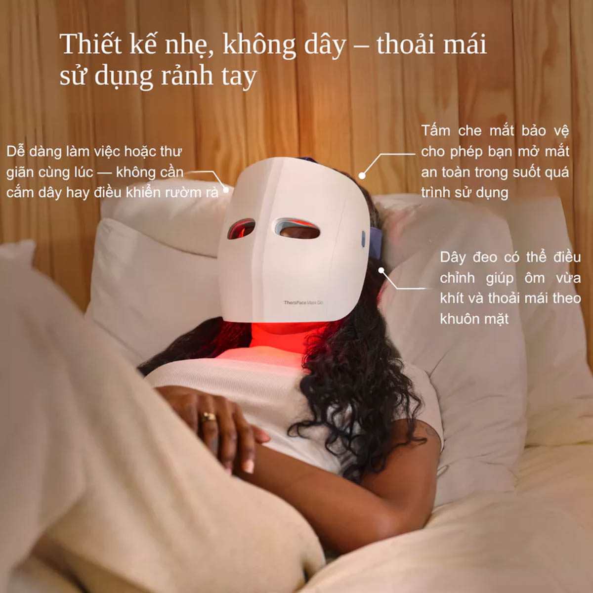 Thiết kế không dây, nhẹ, thoáng khí, ôm vừa khuôn mặt mà không gây khó chịu, dễ sử dụng trong khi làm việc khác.