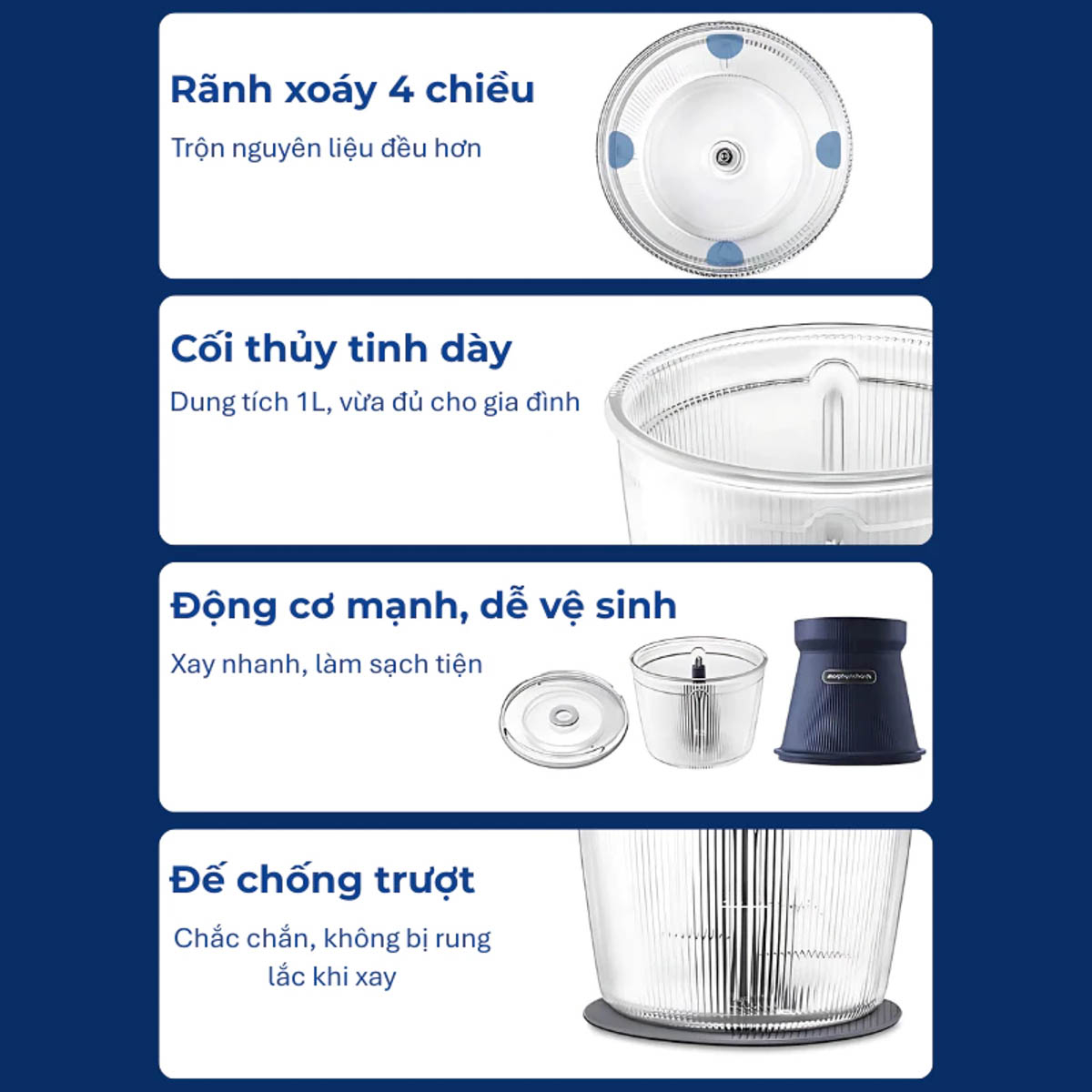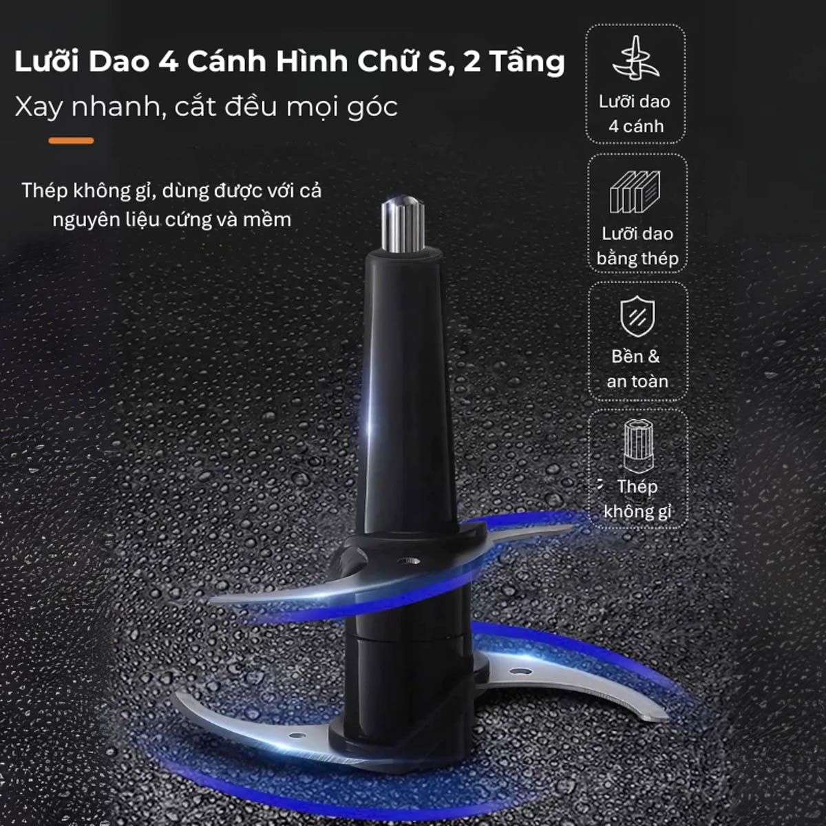 Động cơ đồng bền bỉ – Xay nhanh trong 10 giây – Kết hợp lưỡi dao kép hình chữ S cho thực phẩm mịn đều.