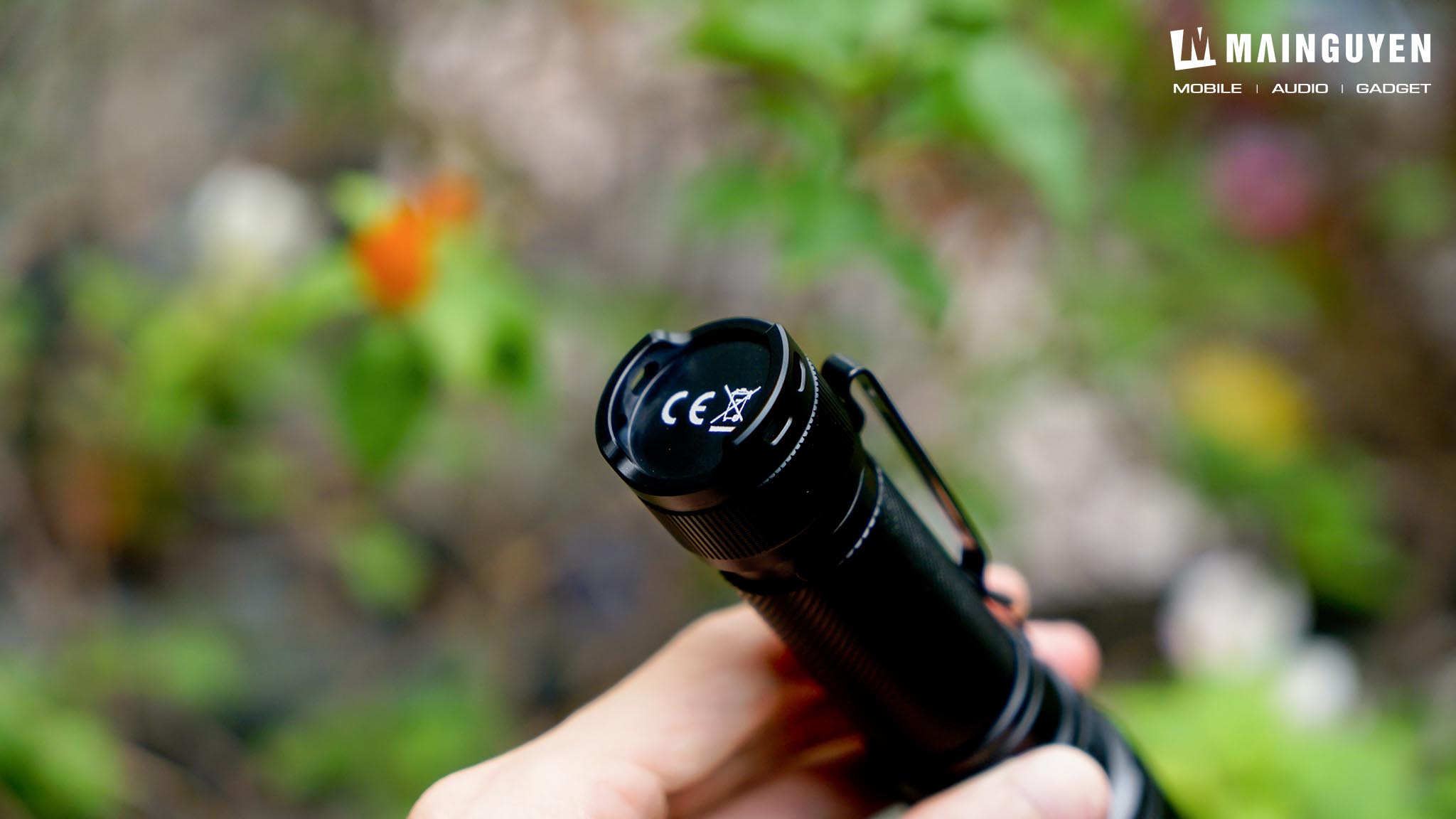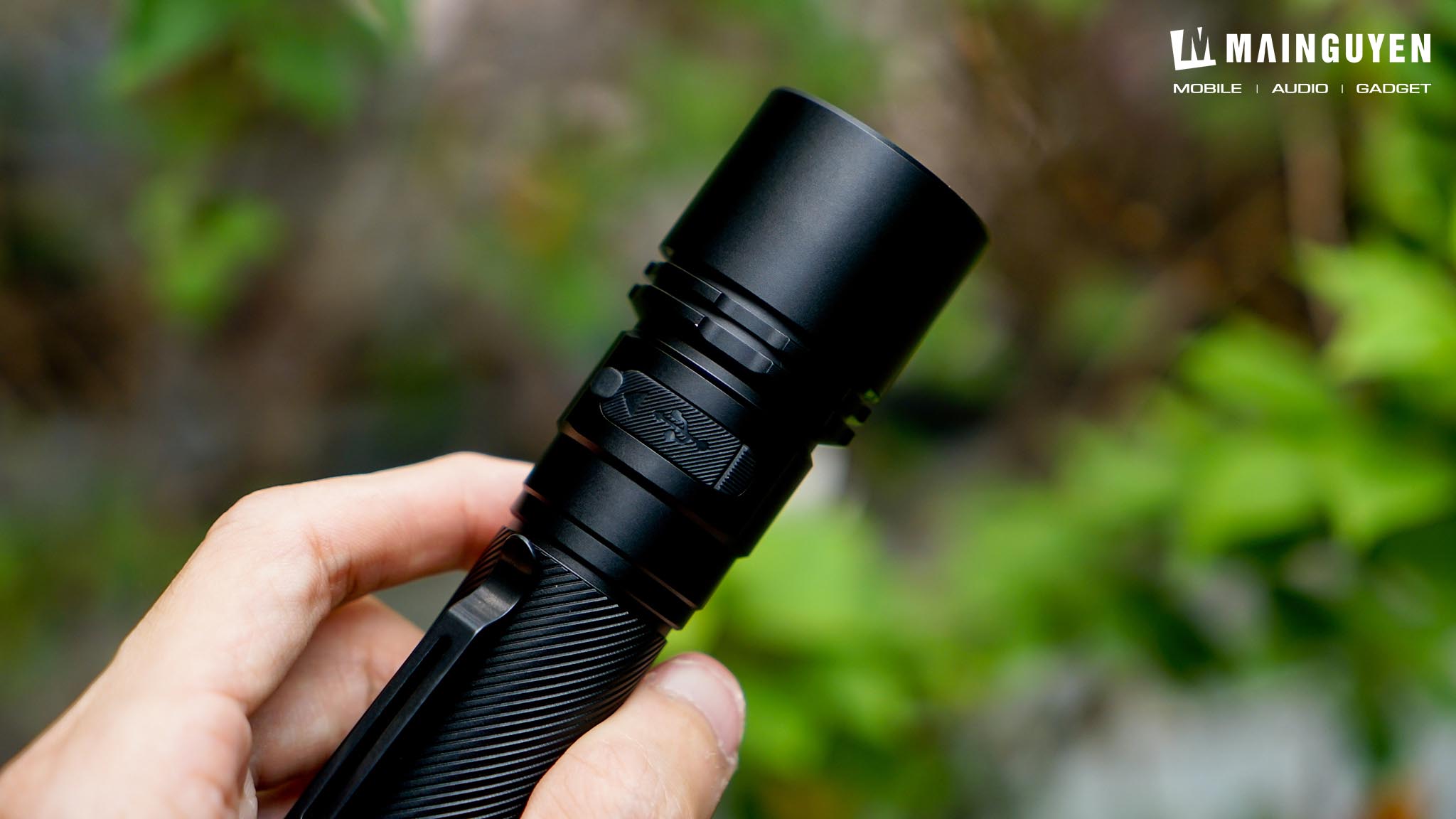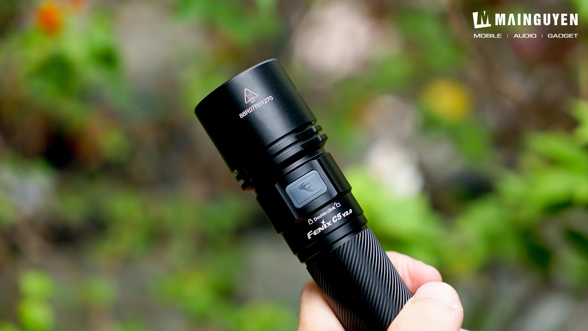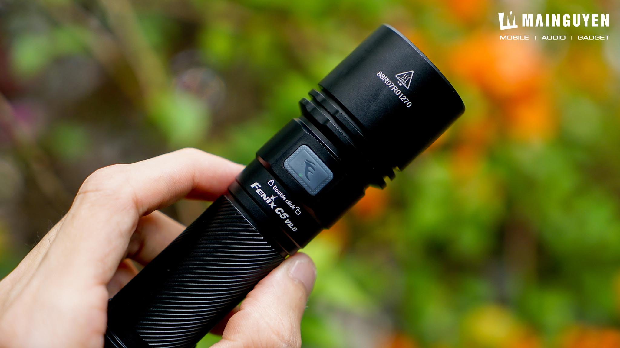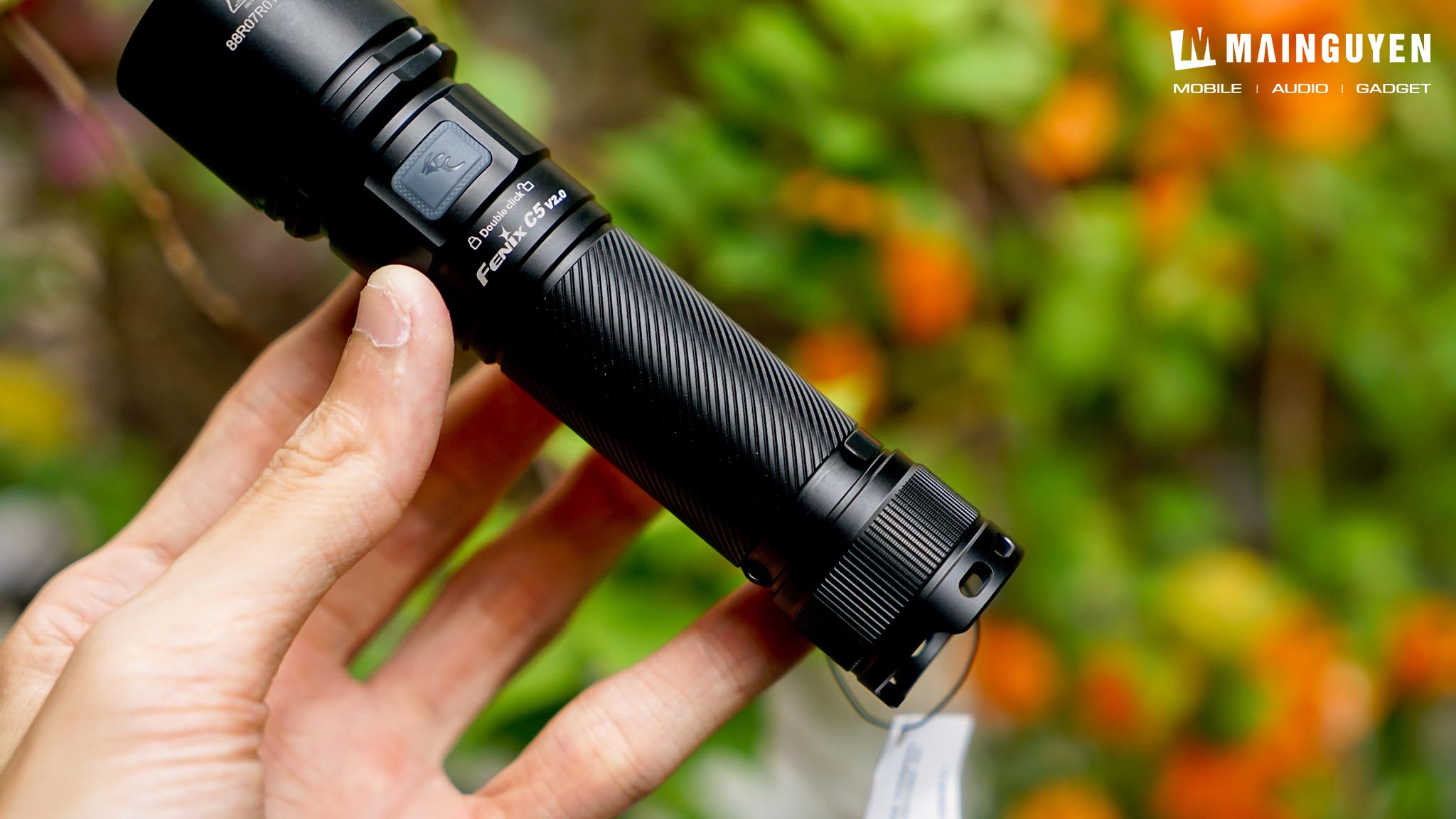 Để lấy viên pin chứa bên trong, bạn chỉ việc vặn xoay phần báng của thân đèn và cũng được làm họa tiết vân dọc để bám tay hơn khi vặn xoay. Và điểm nâng cấp tiếp theo là Fenix đã gia cố phần thân đèn dày hơn đáng kể, mang đến cảm giác cầm rất đầm tay, nam tính và tạo sự tin tưởng rằng dù bạn có lỡ tay làm rơi xuống sàn bê tông hay va quẹt trong lúc sửa xe, đèn vẫn sẽ an toàn. Điểm hạn chế là mẫu C5 V2.0 không được trang bị nam châm siêu khỏe ở bên dưới báng cầm, mà bạn sẽ phải chọn mua phiên bản cao hơn là C5 Pro để có trang bị này giúp dính chặt trên bất kì bề mặt kim loại nào, từ đó bạn thao tác rảnh tay mà không cần chạm đến đèn vô cùng thuận tiện.