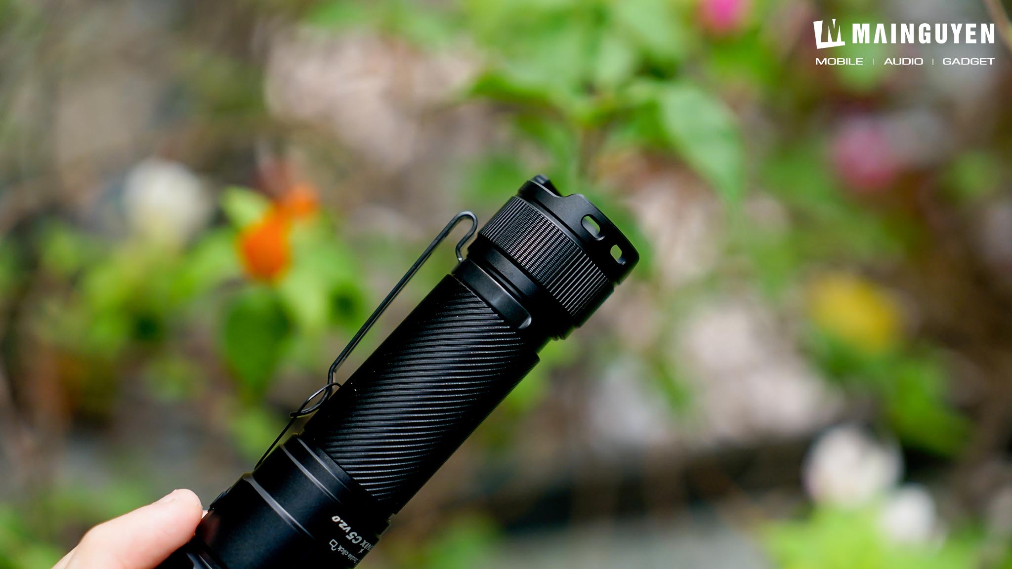 Điểm khác biệt trên mẫu C5 V2.0 so với mẫu C6 V3.0 đó là hãng thiết kế các rãnh vát xiên thay vì dạng ngang, cho cảm giác thao tác cầm nắm tốt và chắc chắn, không bị trơn tuột, có thêm clip kim loại để bạn móc cố định trên thắt lưng, quai balo hoặc bất kì đâu.