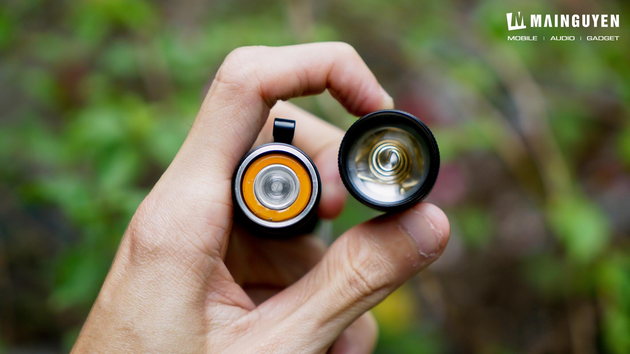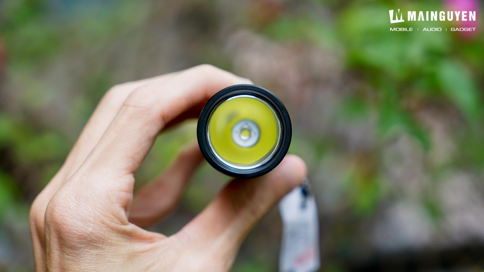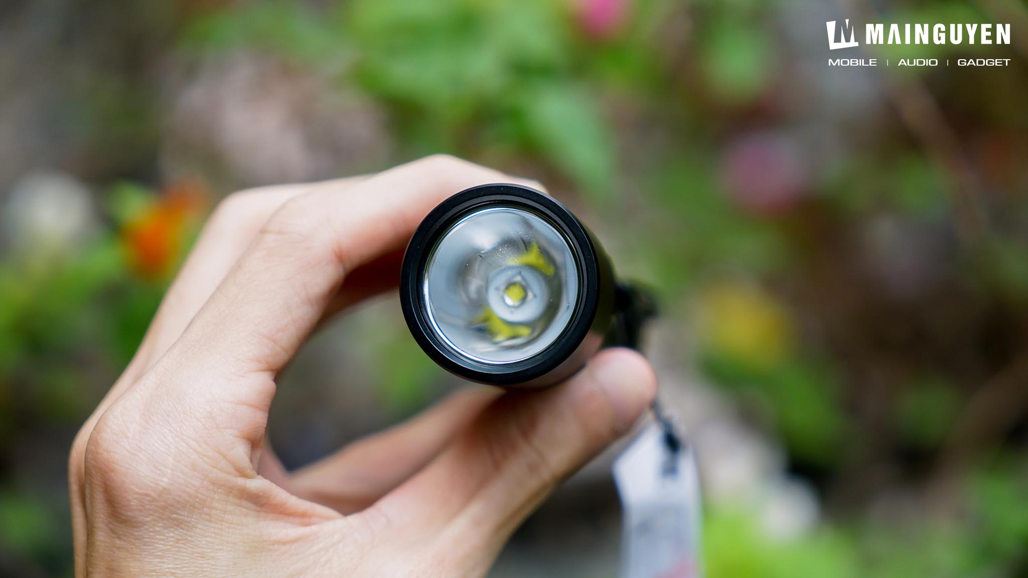 Đường kính phần đầu đèn được thiết kế to hơn so với phần thân, thấu kính trơn TIR cao cấp và trong giúp mang lại nguồn ánh sáng tập trung, kết hợp với đường rãnh vừa tăng tính tản nhiệt vừa tạo điểm nhấn khác biệt hơn. Bên trong là bóng LED Luminus SST40 cho ánh sáng trắng, tuổi thọ hơn 50.000 giờ, độ sáng tối đa lên đến 1800 lumens và tầm chiếu xa lên đến hơn 300 mét. Ánh sáng có tâm điểm (hotspot) rõ ràng, giúp soi xa tốt (hơn 300m), nhưng vẫn đủ vùng tỏa (spill) để quan sát không gian xung quanh không bị chói gắt.