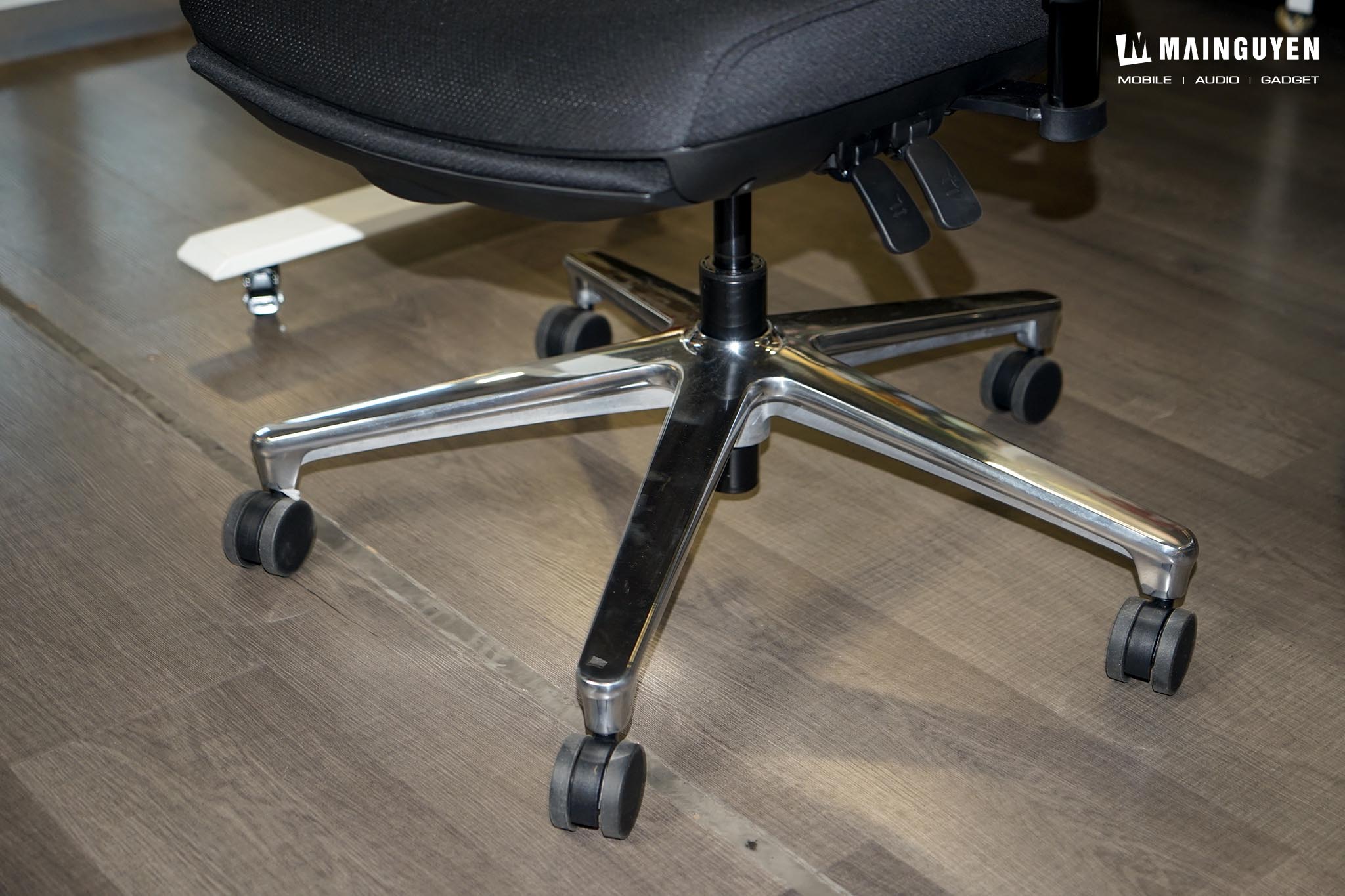Khung chân của ghế làm bằng hợp kim nhôm đúc sáng bóng, chắc chắn và bền bỉ, mang lại sự ổn định tuyệt đối. Bánh xe được thiết kế để di chuyển êm ái trên nhiều bề mặt.