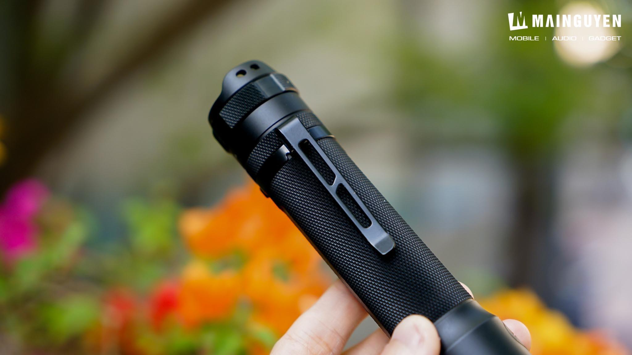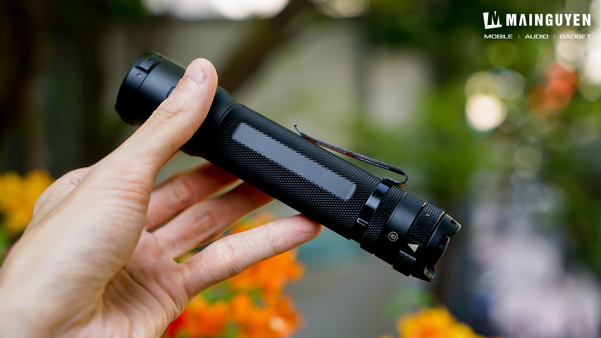 Toàn bộ phần vỏ được làm bằng chất liệu hợp kim nhôm tái chế 75%, trọng lượng khoảng 220g (đã bao gồm pin bên trong), cảm giác cầm trên tay cho bạn sự đầm chắc và tin cậy. Phần báng cầm được phay họa tiết vân kim cương nhuyễn và sâu hơn bình thường, giúp việc cầm nắm cực kỳ bám tay ngay cả khi đeo găng tay hoặc tay đang ướt. Đèn pin TAC7R có khả năng kháng nước kháng bụi đạt chuẩn IP68 và chống sốc ở độ cao tối đa 2 mét, hoạt động ổn định trong điều kiện nhiệt độ môi trường khắc nghiệt từ -20 độ C đến 40 độ C.