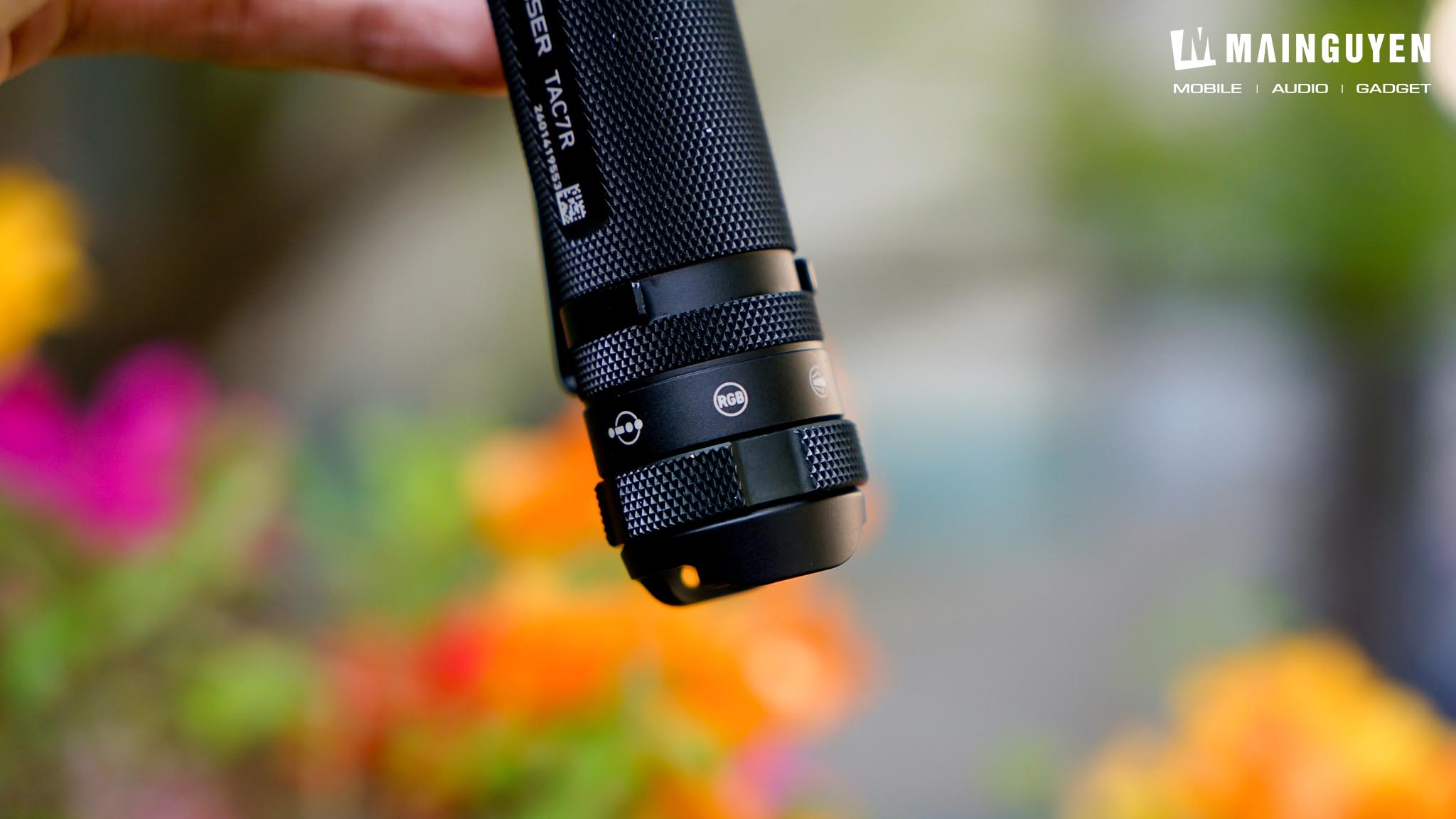 Vòng xoay điều chỉnh chế độ là điểm nổi bật tiếp theo trên đèn pin TAC7R về mặt thiết kế và thao tác sử dụng. Thay vì dùng một nút bấm duy nhất để chuyển đúng chế độ mong muốn (dạng vòng lặp) như các mẫu đèn pin cầm tay khác của LEDLENSER, bạn chỉ cần xoay vòng kim loại vào đúng chế độ bạn chuẩn bị sử dụng (Strobe, RGB, hay Mission) thông qua các biểu tượng được khắc laser dễ dàng nhận biết. Tiếng "tạch tạch" mỗi khi xoay mang lại cảm giác cơ khí rất sướng, kết hợp các gờ nổi được phay họa tiết vân kim cương nhuyễn như phần báng cầm để tăng độ bám khi thao tác bằng găng tay.