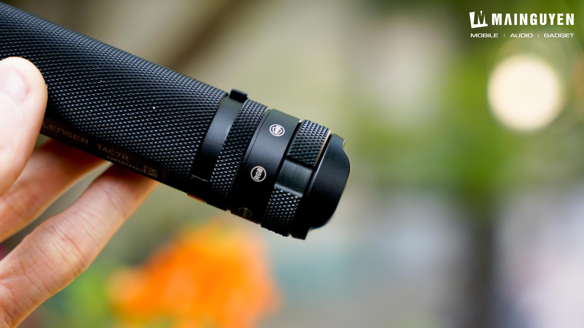 Và điểm nổi bật nhất trên đèn pin tác chiến TAC7R chính là hệ thống quang học Multi-Lens. Khác với những đèn pin sử dụng thấu kính hội tụ truyền thống (Advanced Focus System) để kéo ra thụt vào, TAC7R sử dụng hệ thống Multi-Lens để chuyển đổi giữa luồng sáng tỏa (Flood) bao quát, luồng sáng tập trung (Spot) để soi tầm xa hoặc sử dụng kết hợp cả hai cùng lúc giúp người dùng vừa thấy rõ mục tiêu ở xa, vừa bao quát được môi trường xung quanh. Ánh sáng của đèn pin TAC7R rất sạch, ít nhiễu và vùng chuyển giữa tâm sáng với vùng ven rất mượt mà, đặc biệt là có tính năng Flicker Free để ánh sáng không bị hiện tượng nhấp nháy. Ngoài ra, đèn pin TAC7R còn có chế độ gọi là Backup Mode, khi dung lượng pin xuống dưới mức 25%, đèn sẽ tự động chuyển về chế độ tiết kiệm năng lượng, đảm bảo bạn còn ít nhất 1 giờ ánh sáng để hoàn thành công việc hoặc tìm đường về nhà.