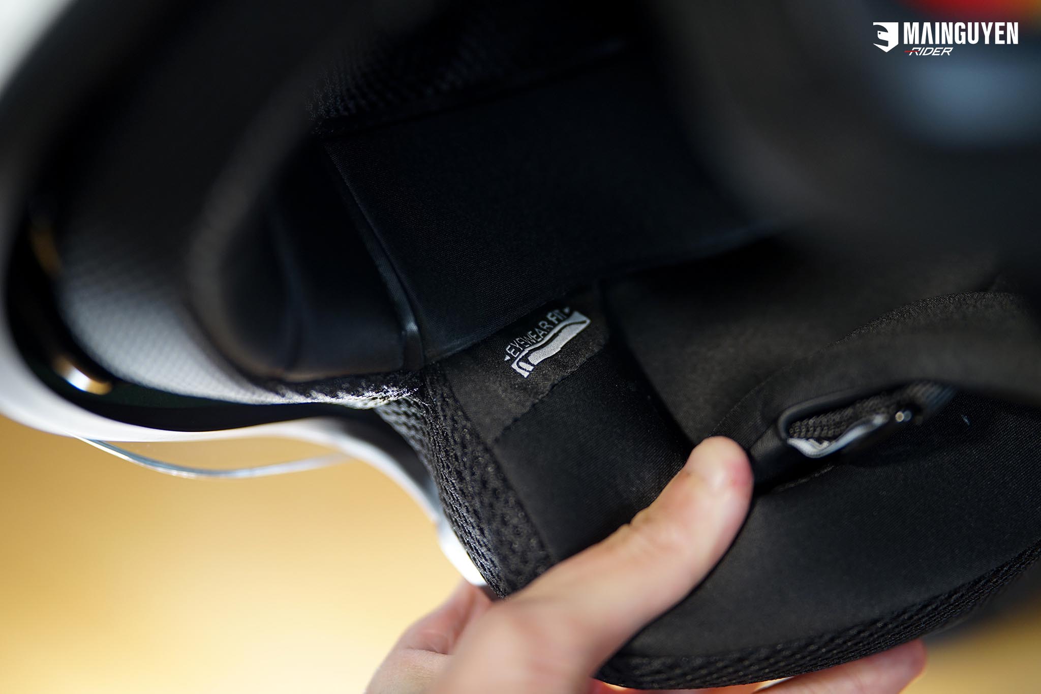 Đối với mẫu Eteres bán chính hãng tại thị trường Việt Nam nói riêng thì phần mút đệm lót bên trong sẽ có kích thước tiêu chuẩn dành riêng cho người châu Á, phù hợp với hầu hết kích cỡ đầu của người dùng Việt. Chất liệu phần mút đệm lót cho cảm giác êm ái, thấm hút mồ hôi nhanh và thoáng khí, dễ dàng tháo rời để vệ sinh hoặc thay thế sau thời gian dài sử dụng, cũng như có sẵn khu vực để bạn sử dụng thêm tai nghe gắn nón bảo hiểm.