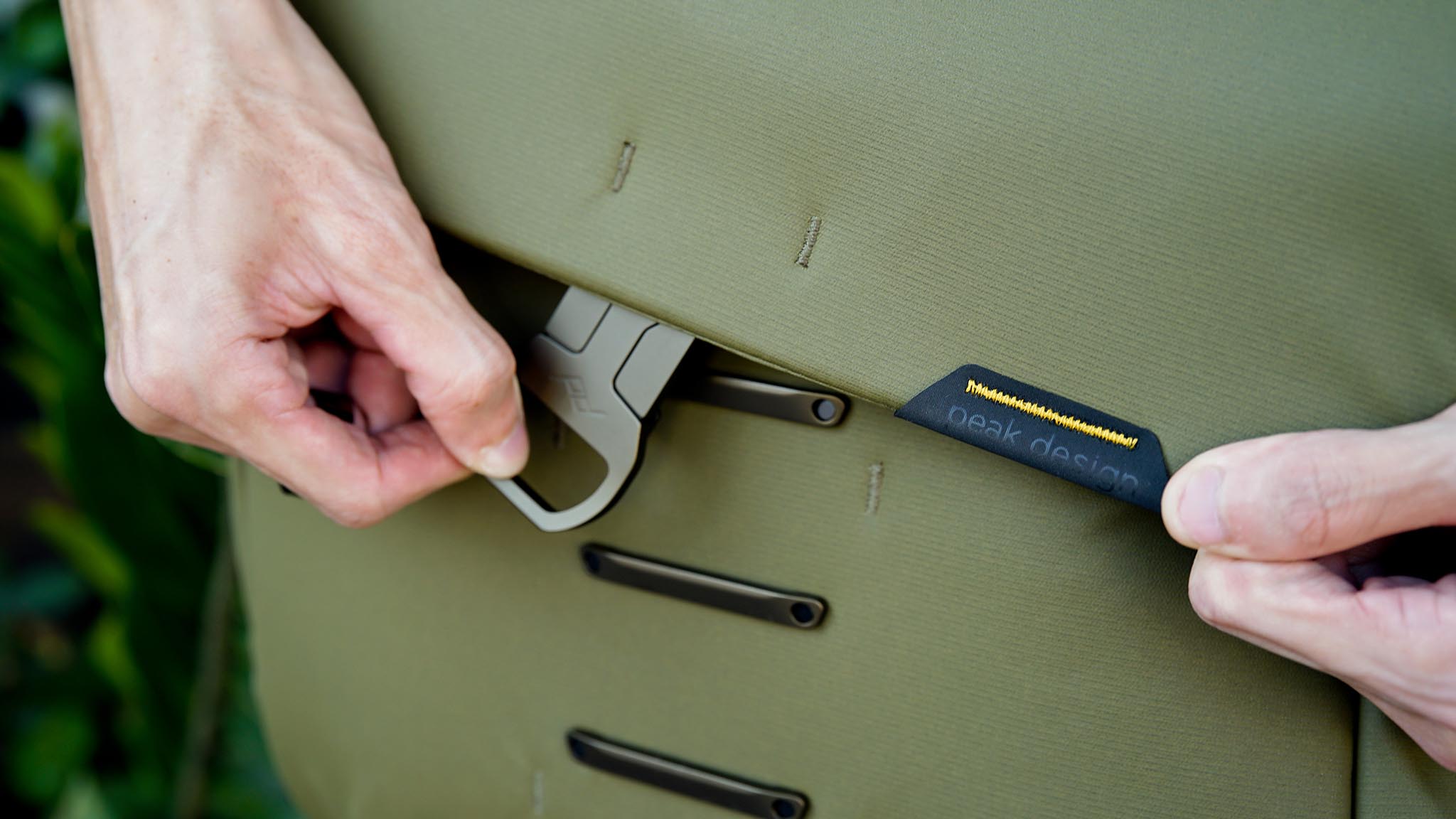 Peak Design còn đi kèm theo 2 dây đai (lash straps) với 10 điểm móc trên túi, cho phép bạn buộc thêm chân máy (tripod) hoặc áo khoác bên ngoài. Túi cũng được trang bị thêm tay cầm phía trên êm ái để xách như cặp táp và có đai xỏ vào tay cầm vali (luggage pass-through) được giữ gọn bằng nam châm khi không sử dụng.