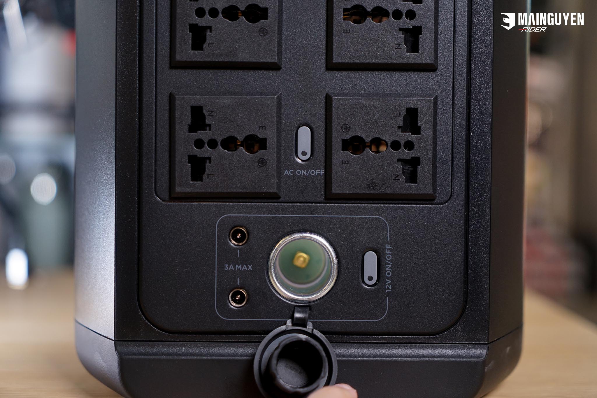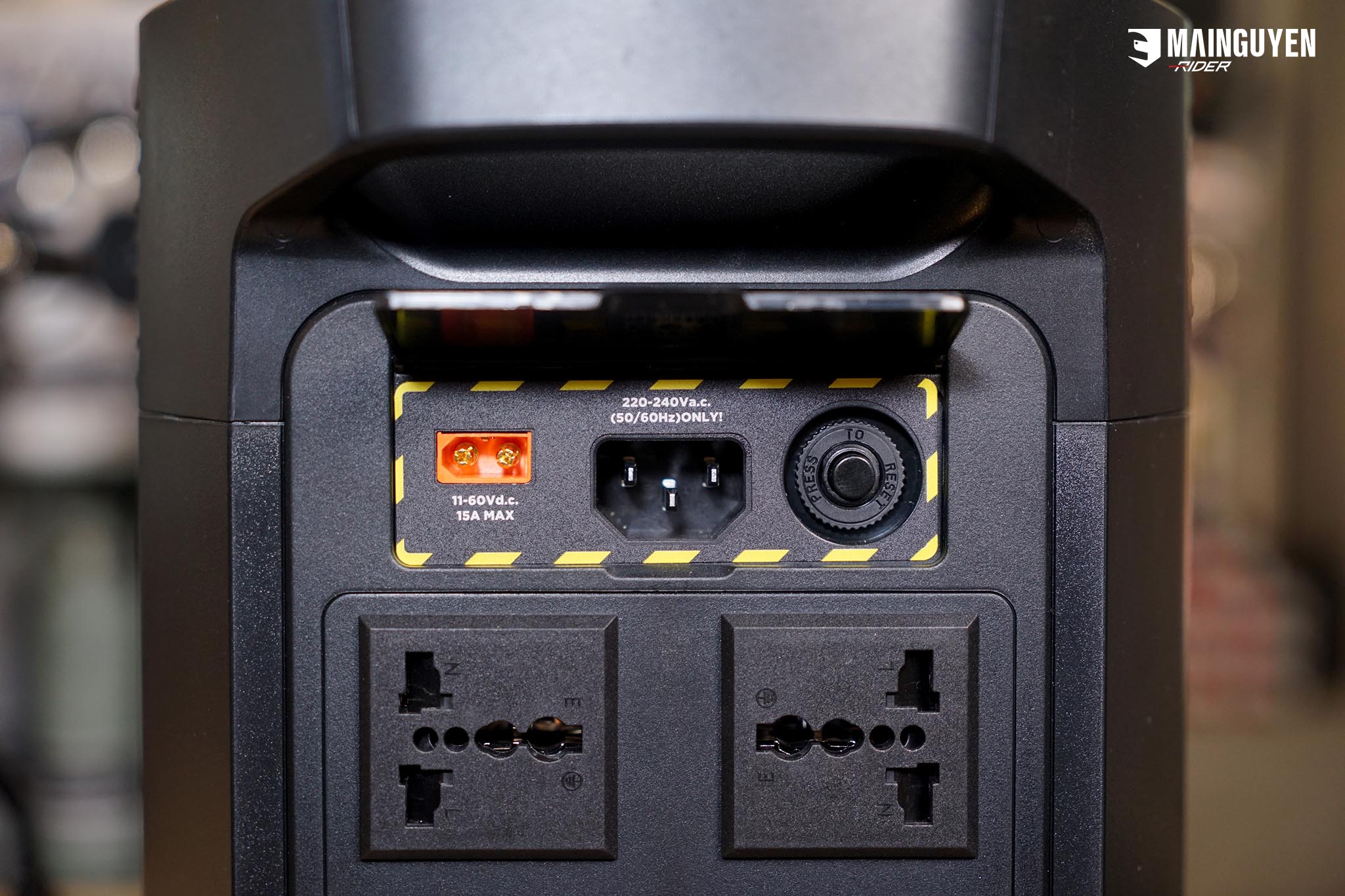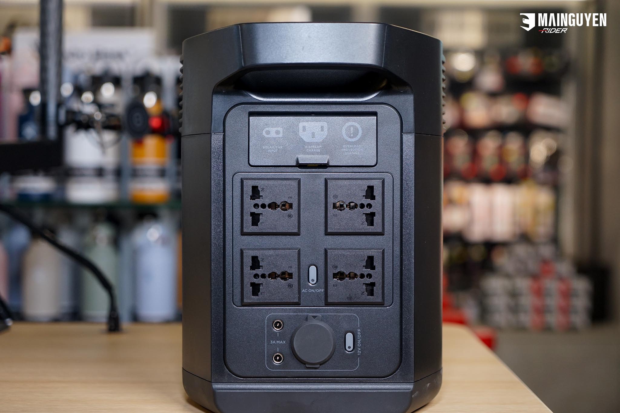 Phía sau có rất nhiều cổng input và output, bao gồm 4 cổng cấp nguồn để sạc điện cho các thiết bị điện thử có công suất lớn như tủ lạnh, nồi cơm điện, quạt máy, laptop, PC, lò nướng, bếp điện,….