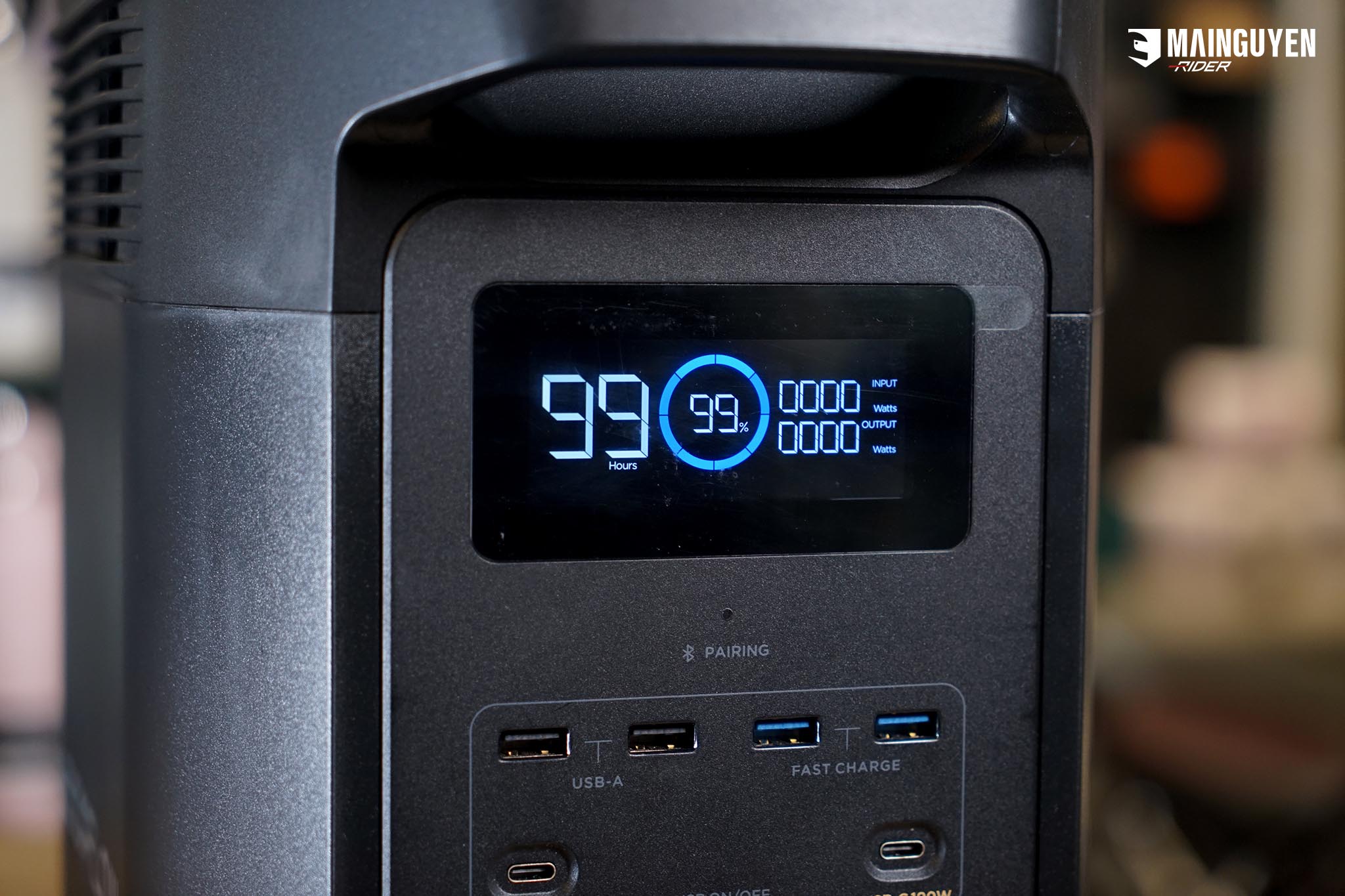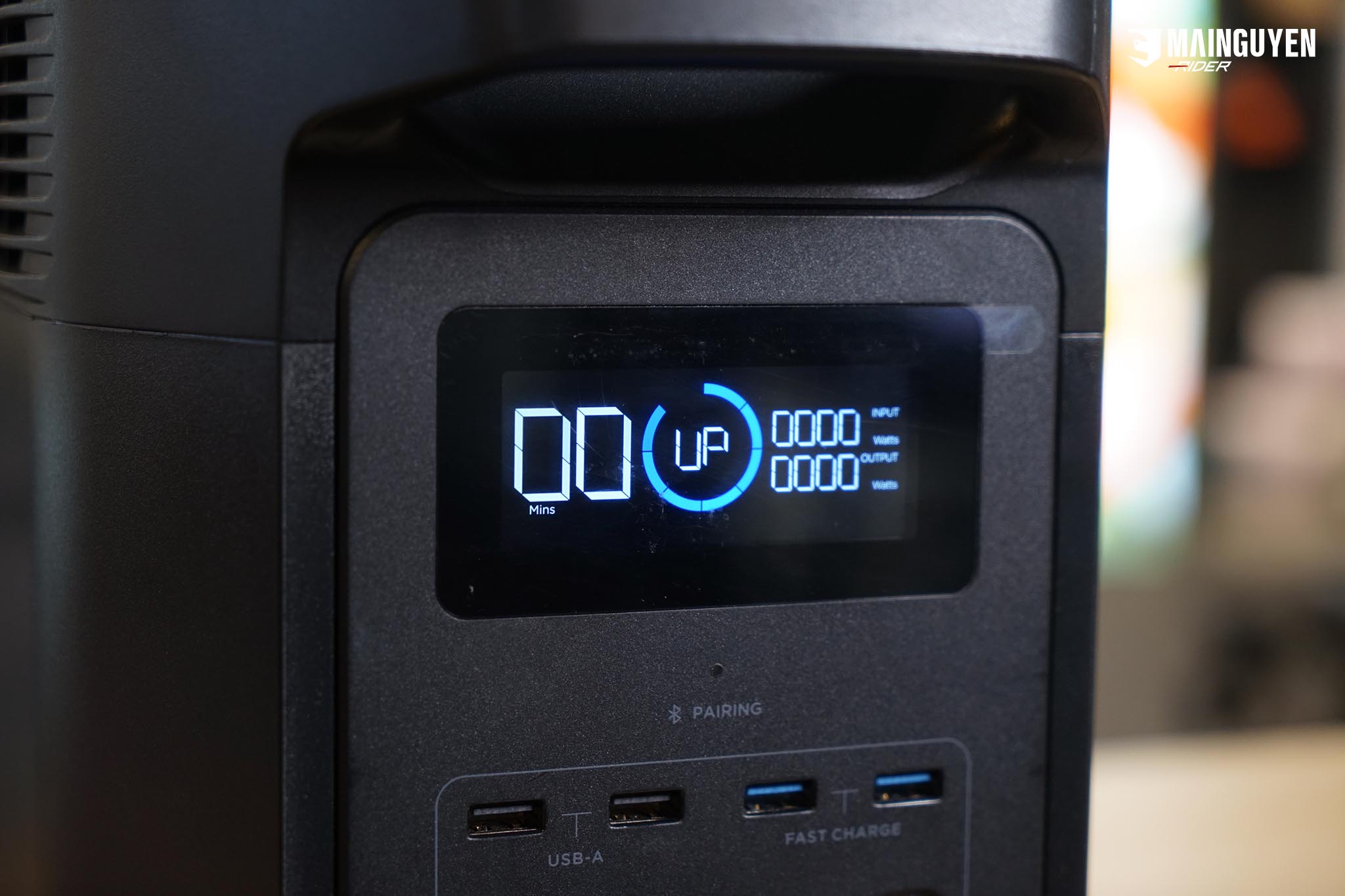 Phía trước trạm sạc năng lượng EcoFlow DELTA 2 Black (E980) là nơi bố trí thêm các cổng output và màn hình hiển thị. Bao gồm: 4 cổng output USB-A, 2 cổng output USB-C, nhờ số lượng cổng kết nối rất nhiều nên DELTA 2 Black (E980) đáp ứng cho nhu cầu sử dụng cường độ cao. Nút bấm cứng duy nhất dùng để bật/tắt màn hình hiển thị, và tắt nguồn hoàn toàn khi không cắm nguồn để sạc điện cho DELTA 2 Black (E980). Bên cạnh đó, các khu vực cổng output đều có nút bấm cứng riêng để bật/tắt nguồn hoàn toàn, giúp tiết kiệm lượng điện thất thoát ra ngoài gây lãng phí do phải luôn ở chế độ chờ.
